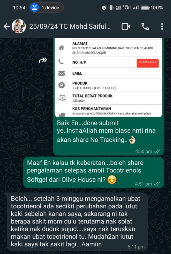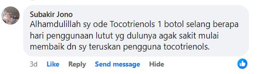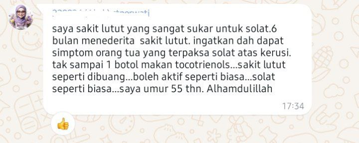 Sakit lutut. Sangat sukar untuk solat. Tak sampai 1 bulan makan tocotrienols, sakit lutut seperti dibuang. Boleh solat seperti biasa