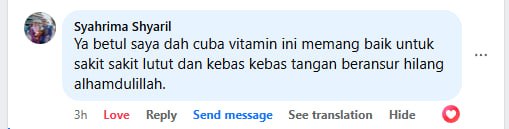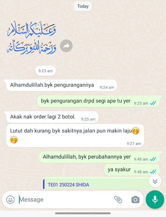 Lutut dah kurang banyak sakitnya. Jalan makin laju. Nak order lagi 2 botol